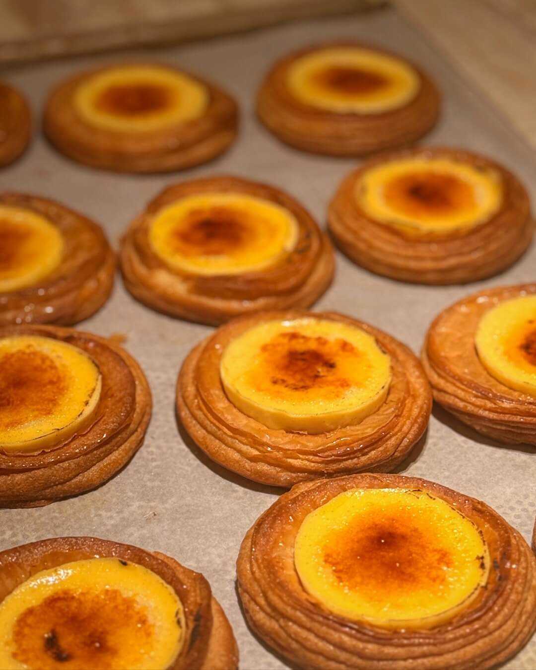 A delicate fusion of two classics. Beneath its crisp, flaky croissant shell awaits a silky Madagascar vanilla crème anglaise — smooth, fragrant, and luxuriously creamy. Finished with a thin layer of brûléed sugar that cracks gently with every bite.
