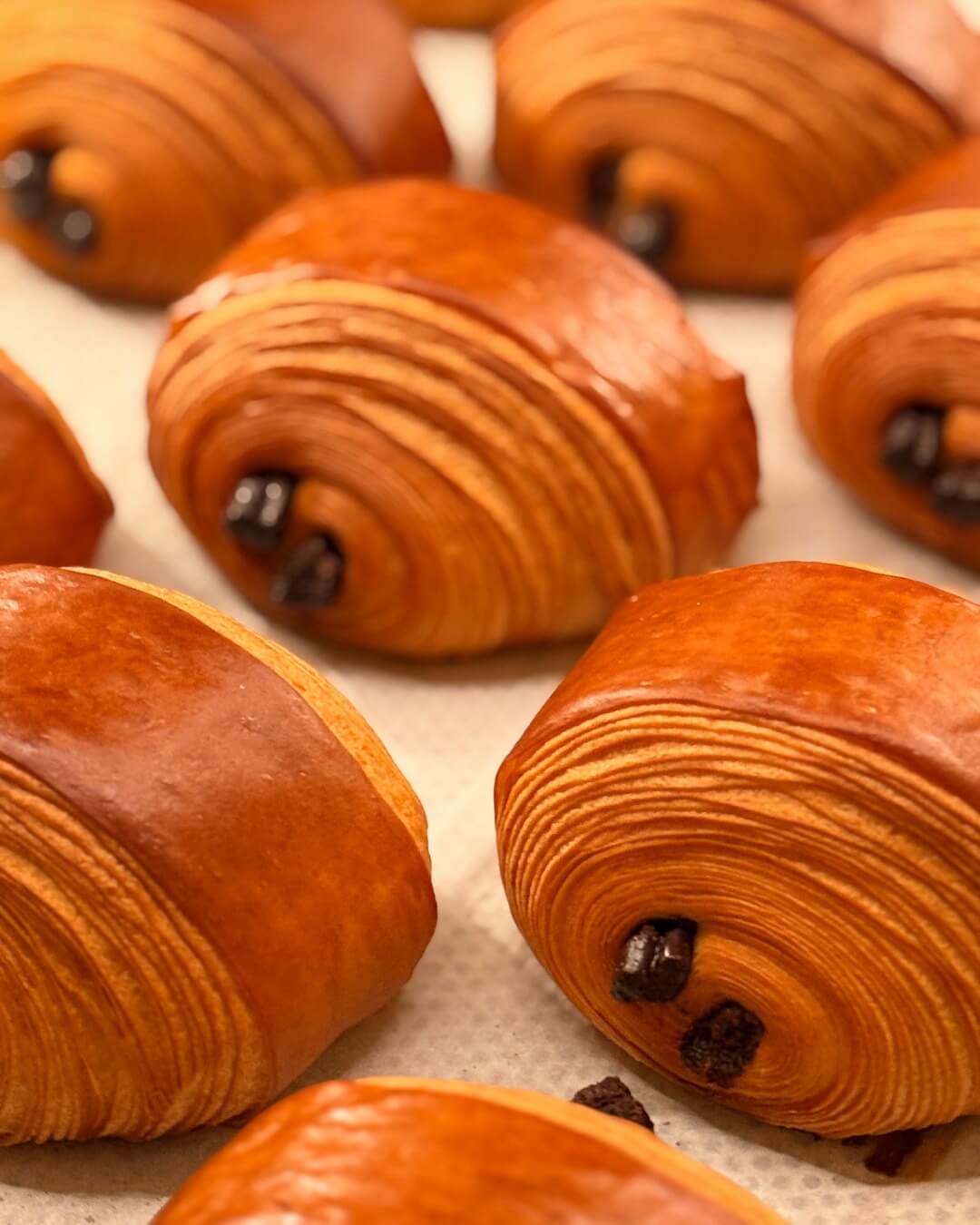The signature Pain au Chocolat of et CLAIRE, golden and delicately crisp on the outside with a light, airy softness within.